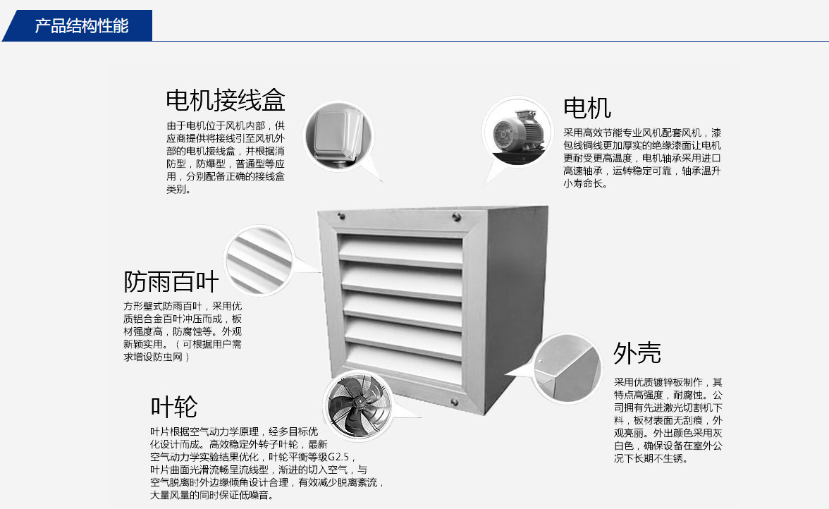 1.2.按直径分为250~700mm共10个规格,每一规格风机叶片数都为4片,风量600~15000 m3/h,风压40~170Pa。