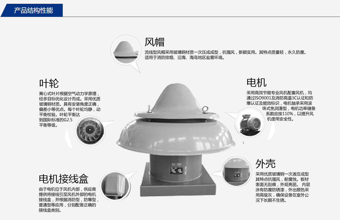 1.1.DWT-II型玻璃钢离心式屋顶风机,其叶轮采用离心式叶轮,可适用风量小而压力较高的场所;采用单层风帽。