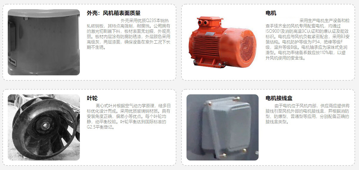 1.3.风机根据不同环境需求,可制成防爆型,适用于非腐蚀的含有易燃、易爆气体的场所,防腐型可适用于含有腐蚀性气体的环境中。