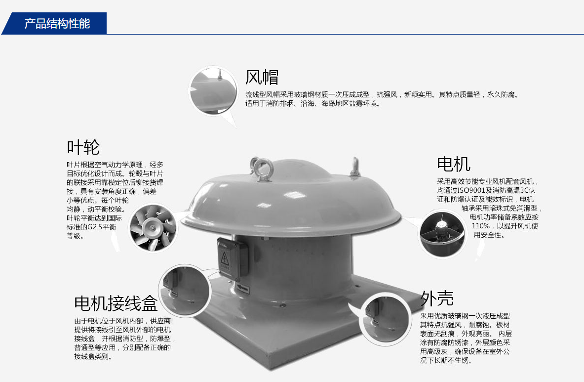 ● 机壳(风筒、电机支架); ● 玻璃钢风帽。