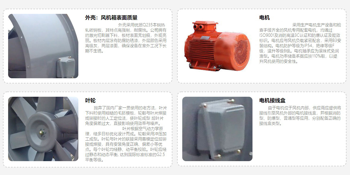 5.1、风机叶轮:固定角度屋顶风机风机叶轮十字架为钢制冲压下料,液压成形,叶片为铝合金冲压后液压成形,叶片与十字架铆接装配成形;可变角度屋顶风机叶轮十字架为铝压铸成型,叶片为铝合金冲压后液压成形。叶轮经静、动平衡校正,平衡精度不大于G5.6级。